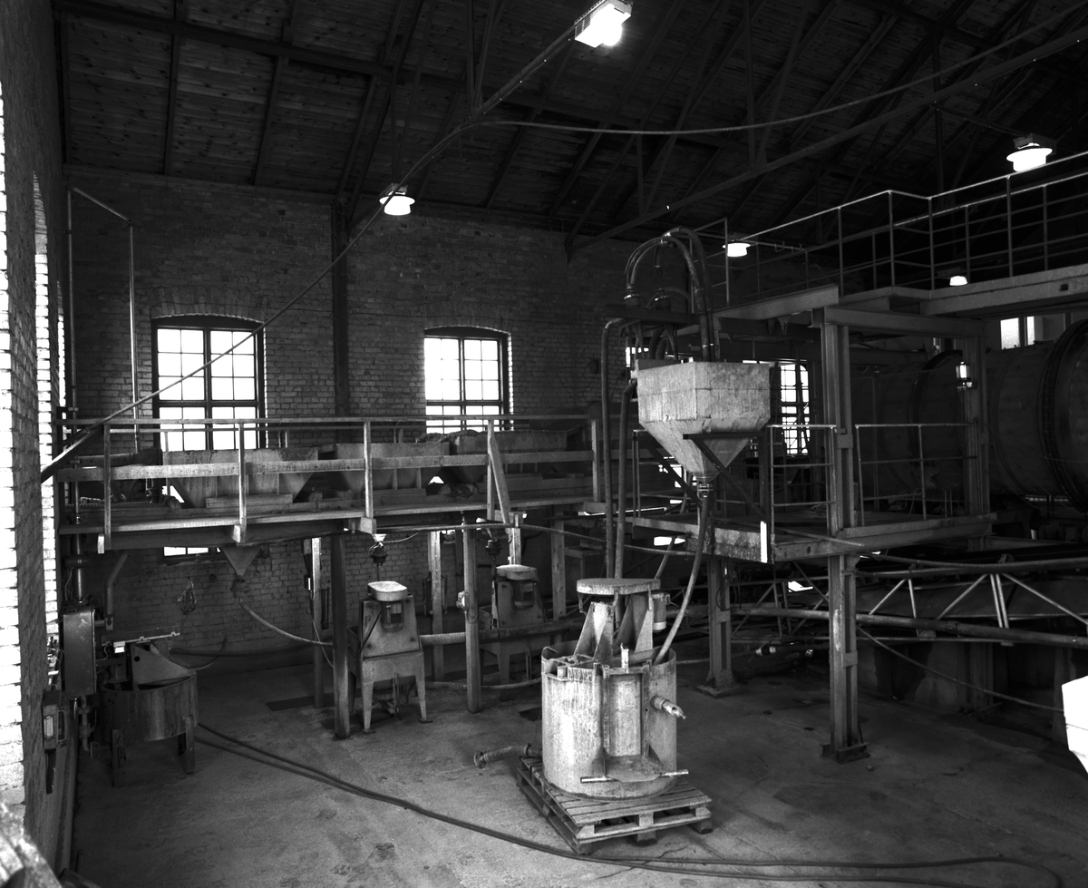 Ockra ett helt obränt pigment, från samma råvara som Falu rödfärg. Det som syns i mitten av bilden är utrustningen förcyklonering av råvaran.