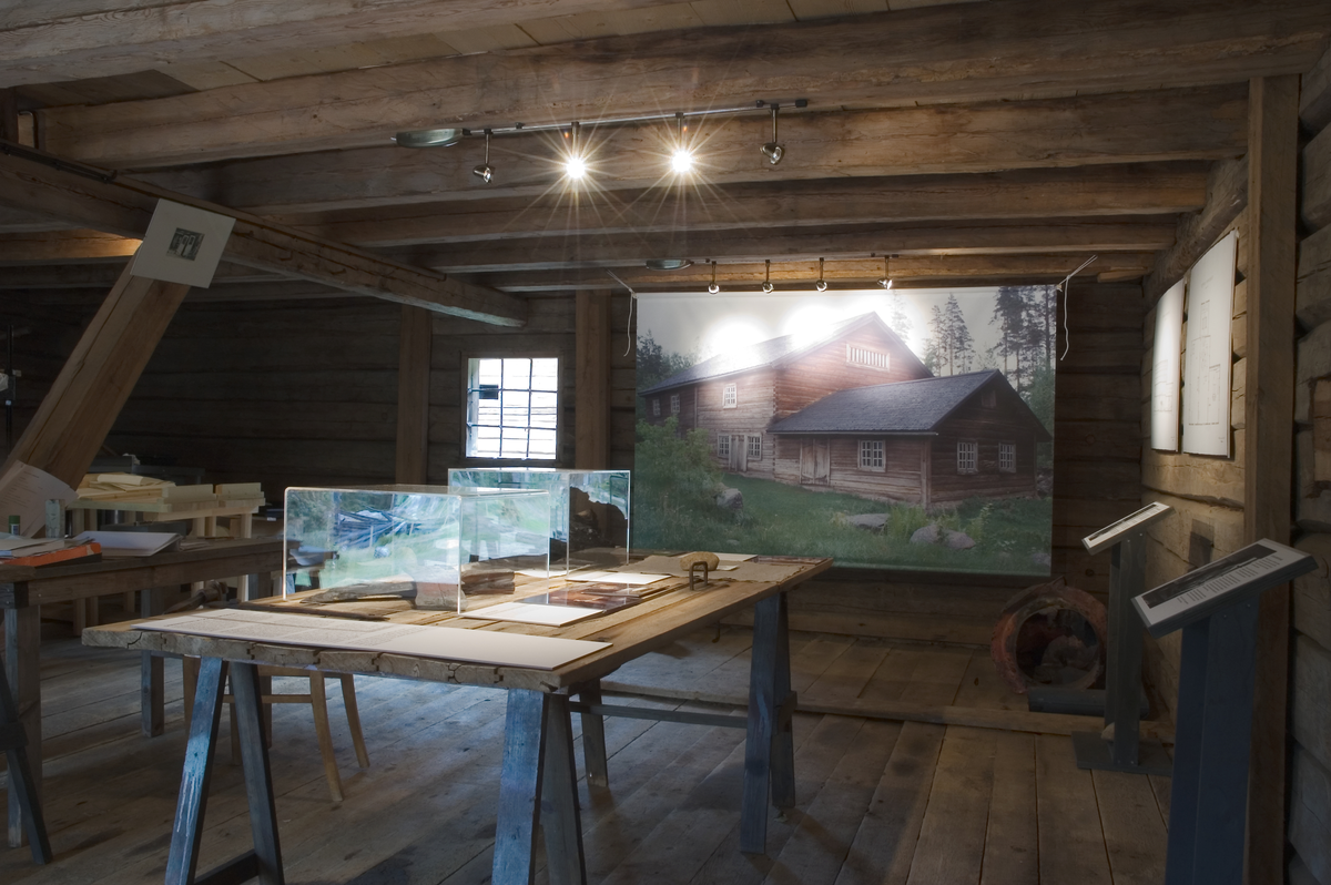 Interiör från pappersmagasinet med utställning om branden och demonstration av papperstillverkning