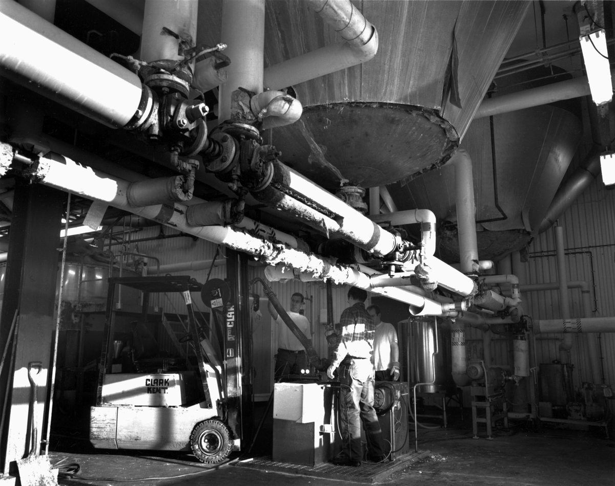 Arbetsledare Rune Blomqvist, Håkan Palm och Patrik Holm kontrollerar flödet i "Ph brunnen", där allt kylvatten pumpas till reningsverket. Endast rätt Ph får pumpas ut.