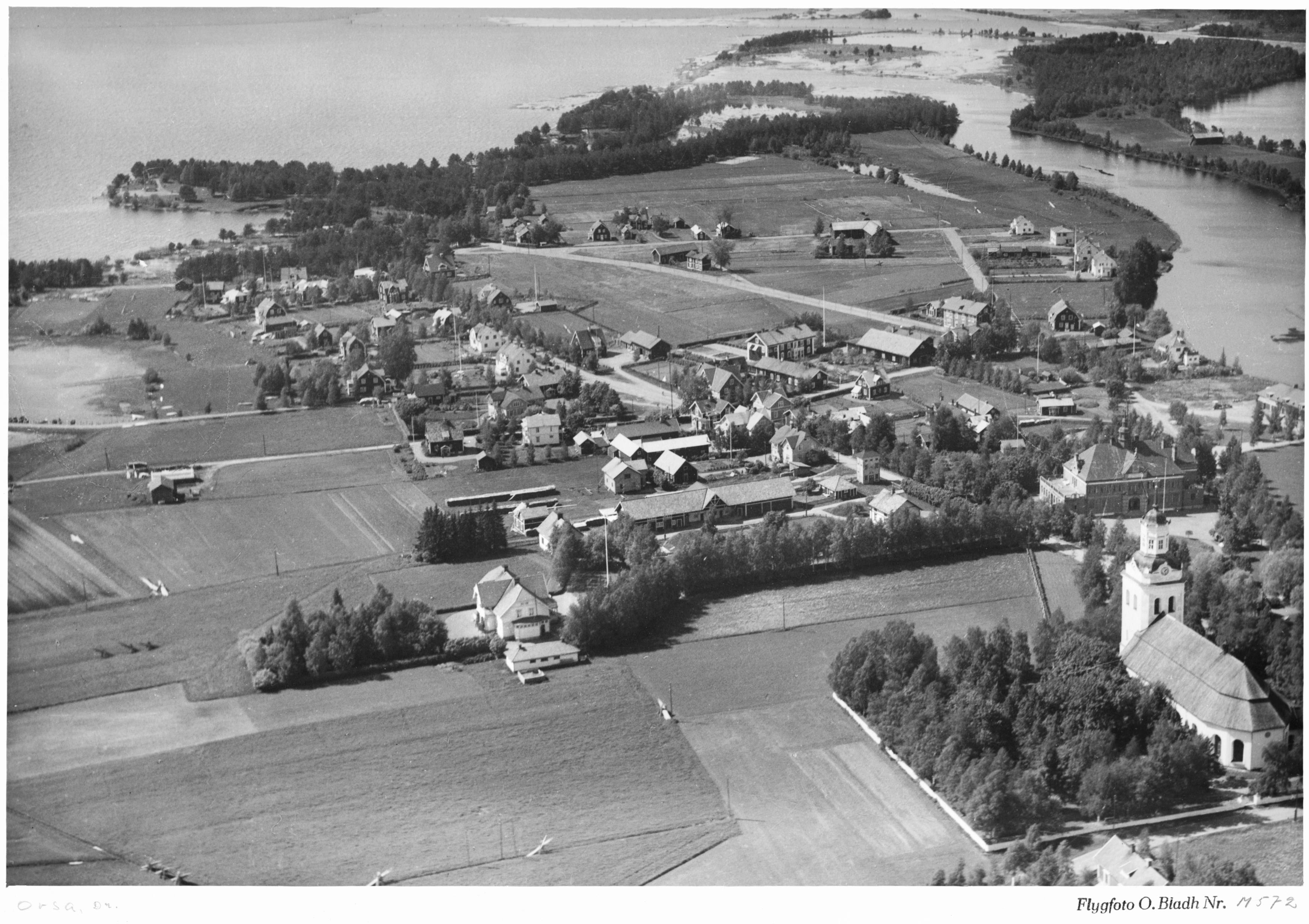 Flygbild över Orsa med kyrkan till höger, från sydöst.