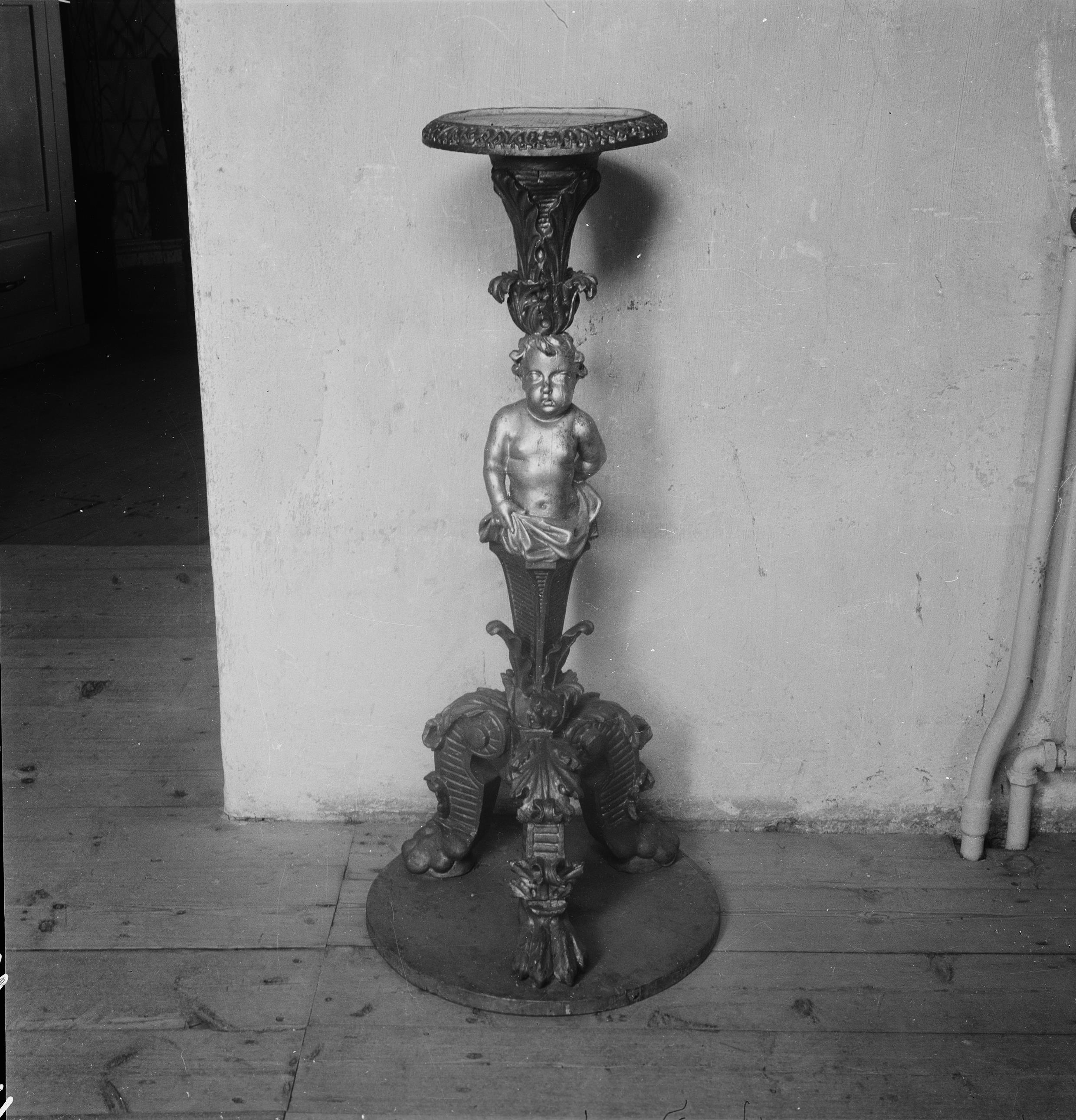Guéridon, förgyllt trä, herm i gossgestalt, står på tre djurfötter, början av 1700-talet. Gåva av Johan Jansson Teller 1787.