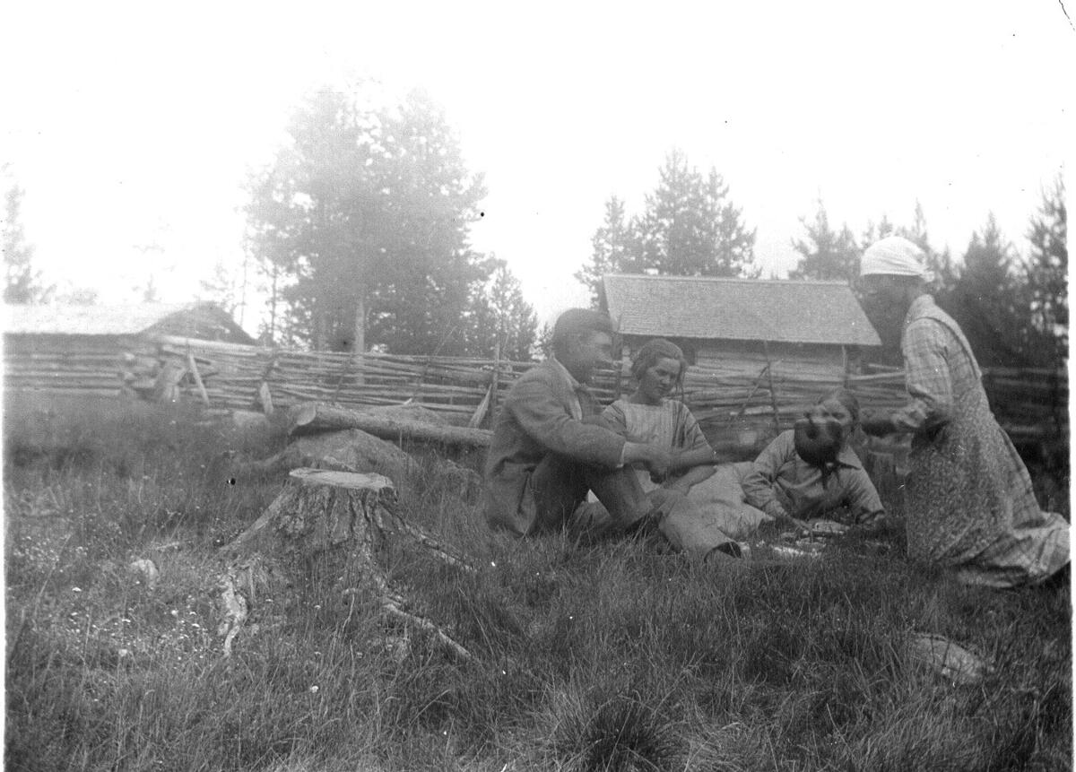 Stockbergets fäbodvall, Långsele. Hörde till Eden. Till höger, Irene Forssén. Inhägnaden runt husen kallades "bogäla". Getmese kokades ute i det fria i stora järngrytor uppställda på stenar i en grop. Platsen var inhägnad och kallades "mesgäla". Fäbodbruket avtog så småningom och upphörde helt omkring 1954.