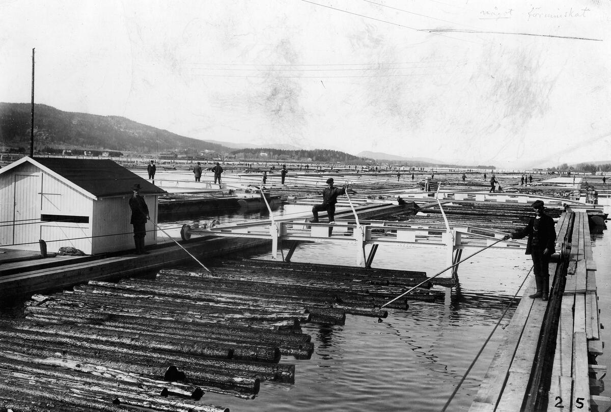 Sandslåns timmerbuntningsverk tillverkat av Hernösands Verkstads och Varfs Aktiebolag, vagnen skjuter just ihop bunten med sina trenne svärd, 8 st. Dylika verk, drivna elektriskt finnas vid Sandslån å vardera minimalt 40 maximalt 70 hästkrafter. Därjämte finnas 2 st drivan av råoljemoter, å respektive 25 och 30 hästkrafter. En färdig normal bunt innehåller 80 à 150 sågstockar eller 200 à 300 papptimmer, beroende på virkets grovlek. Ett bogseringslass färdiga buntar kan innehålla ända till 200 buntar och mera. Bunten omspännes medels 15 meter långa 3/8 kättingar, låsta med spak. I bogseringslassen sammanhålles buntarna sinsemellan av 12 m/m i diameter, 12 meter långa, 72-trådiga stållinor.