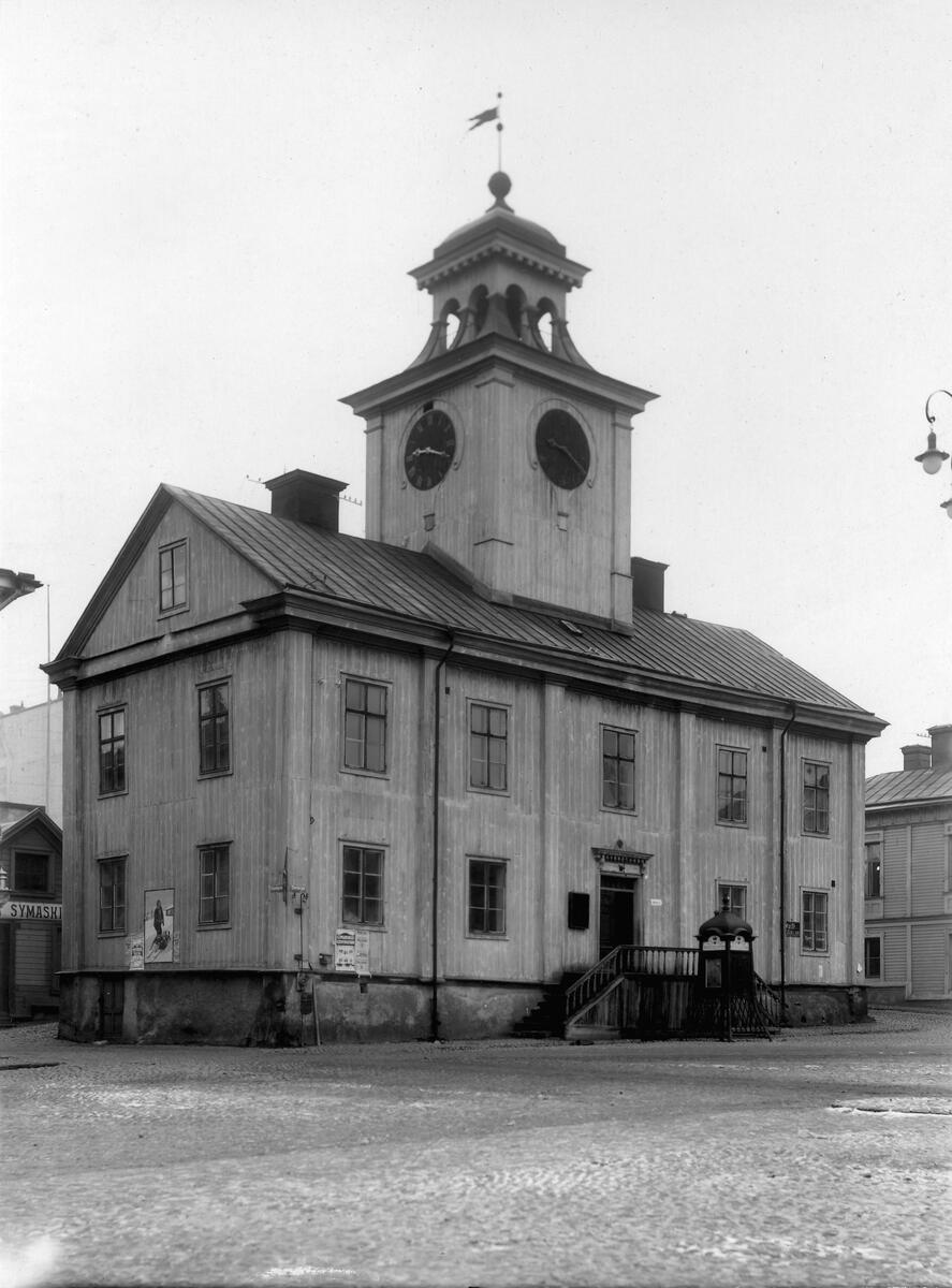Gamla rådhuset på ursprunglig plats. Rådhuset byggdes åren 1725-1729. Det var ursprungligen en rödmålad byggnad med blåa knutar. Sitt nuvarande utseende fick rådhuset vid en restaurering 1815. Tornet ritades och byggdes av den österbottniske snickaren Hans Biskop, som även hade varit engagerad vid kyrkobygget i staden. I tornet installerades ett Stjernsundsur samt en rådstuguklocka för vårdringning. På övervåningen låg magistratens lokaler med rådstugusalar, arkiv och förmak. Här fanns även rum för övernattning. På bottenvåningen låg stadskällaren. Under åren 1827-74 hade Härnösands sparbank sina lokaler i rådhuset. Som rådhus användes byggnaden fram till 1882. Den flyttades till Murberget 1920 eftersom huset då skulle rivas och ge plats för Sundsvallsbanken, nuvarande Nordea.