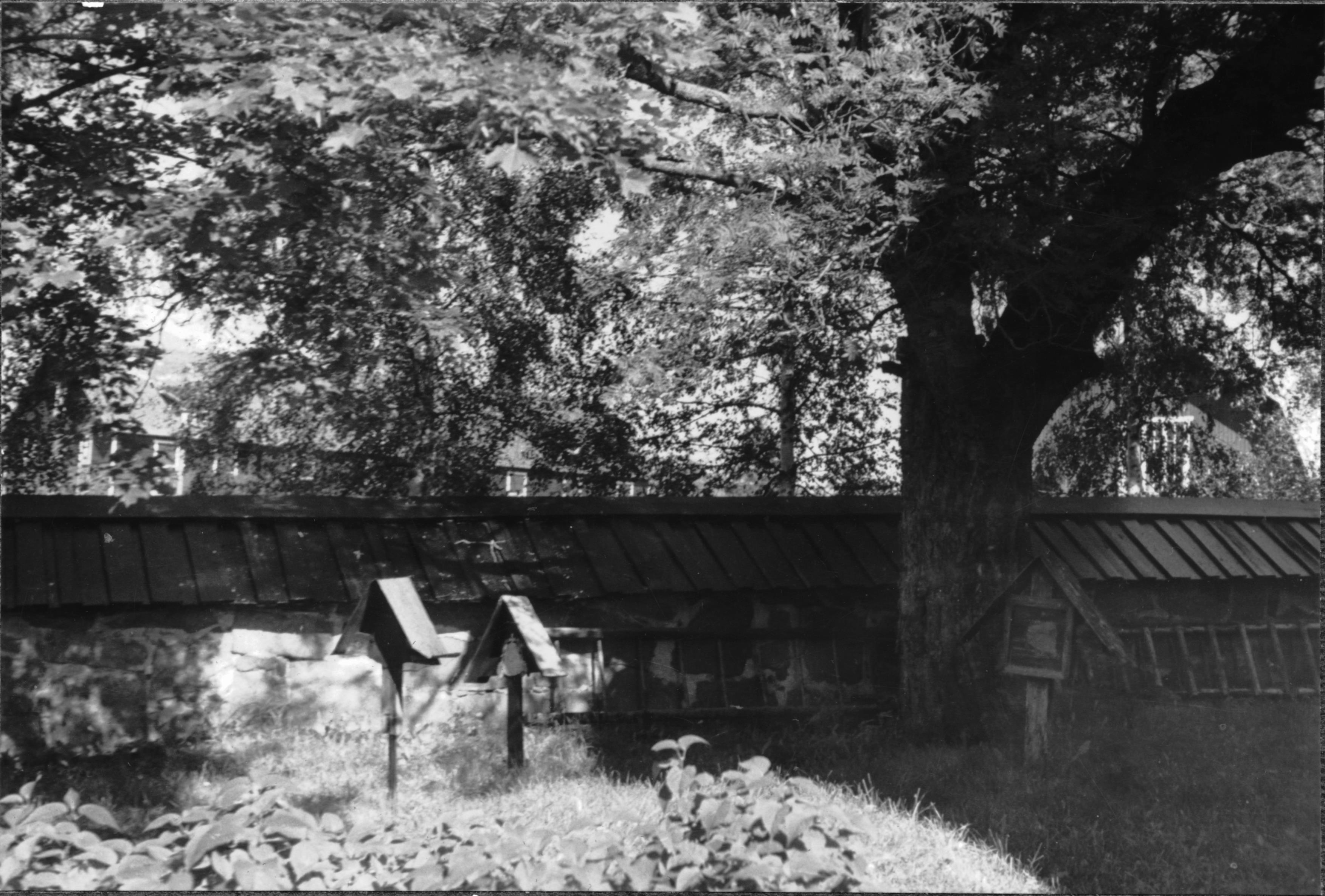Gamla gravvårdar av trä nordväst om kyrkan.