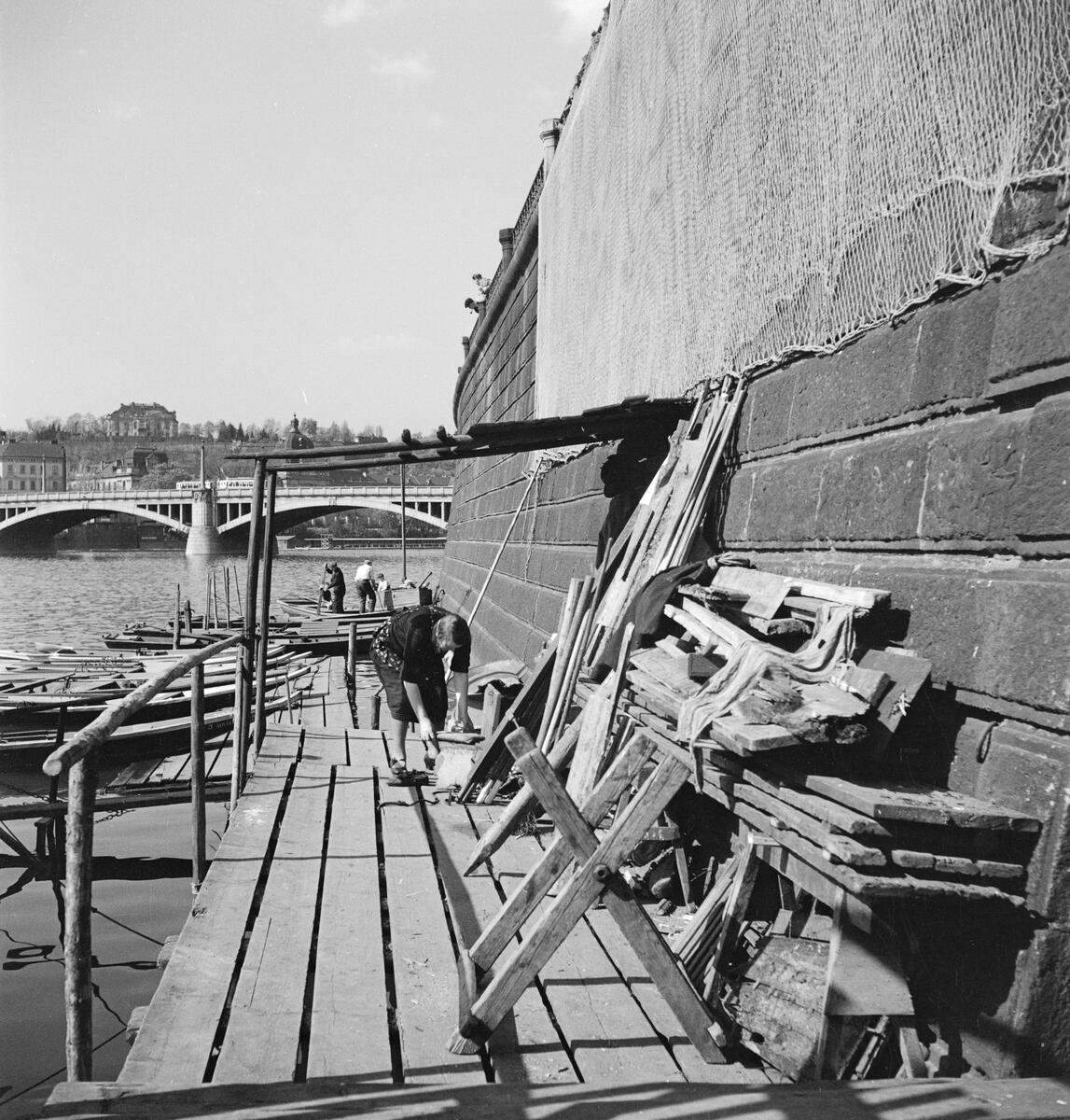 Båtar vid en brygga på floden Moldaus östra sida. I bakgrunden Mánes-bron. Tjeckoslovakien-Ungern-Österrike 1935.