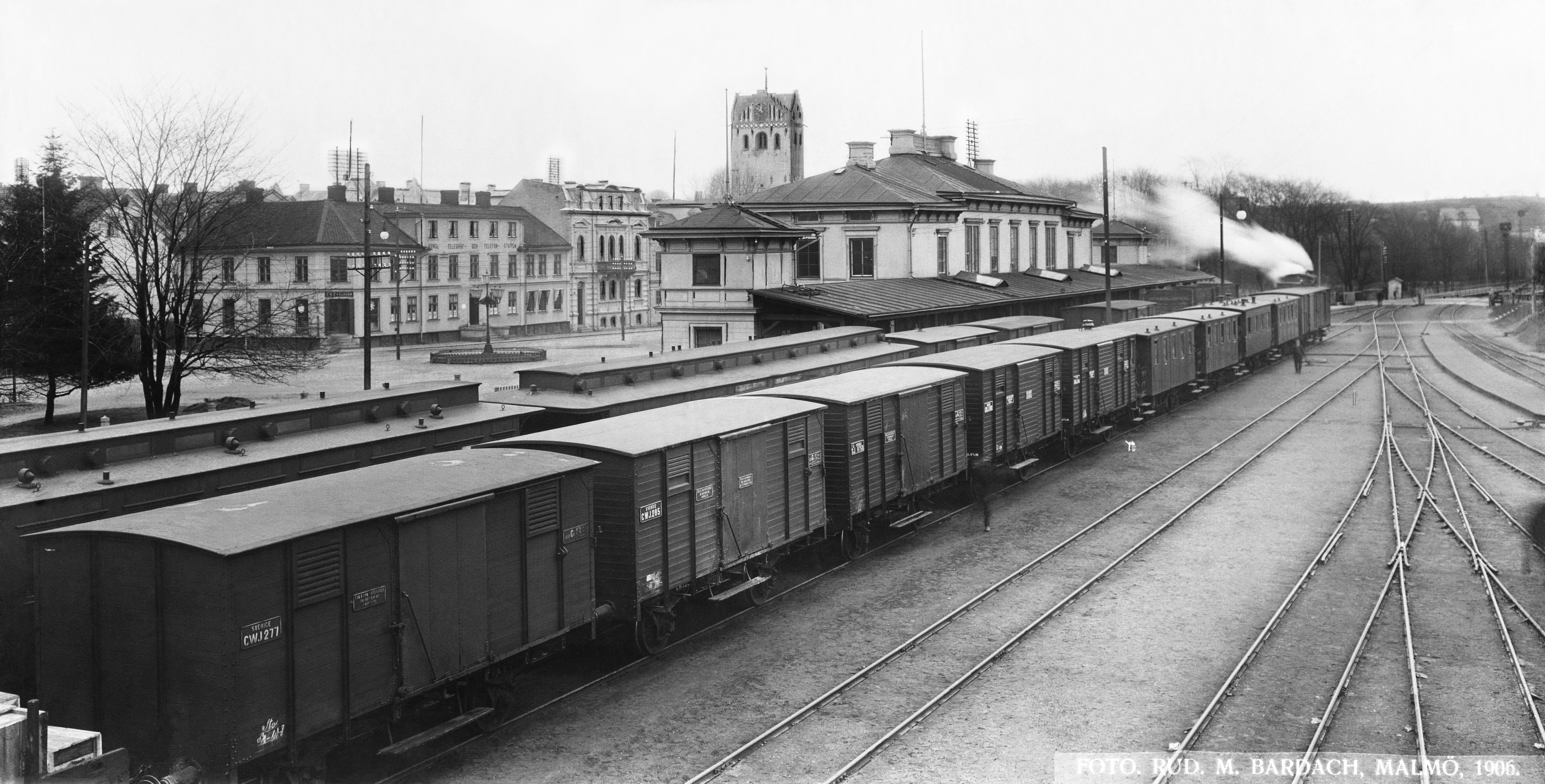 Järnvägsstationen med godståg. I bakgrunden Växjö domkyrka.