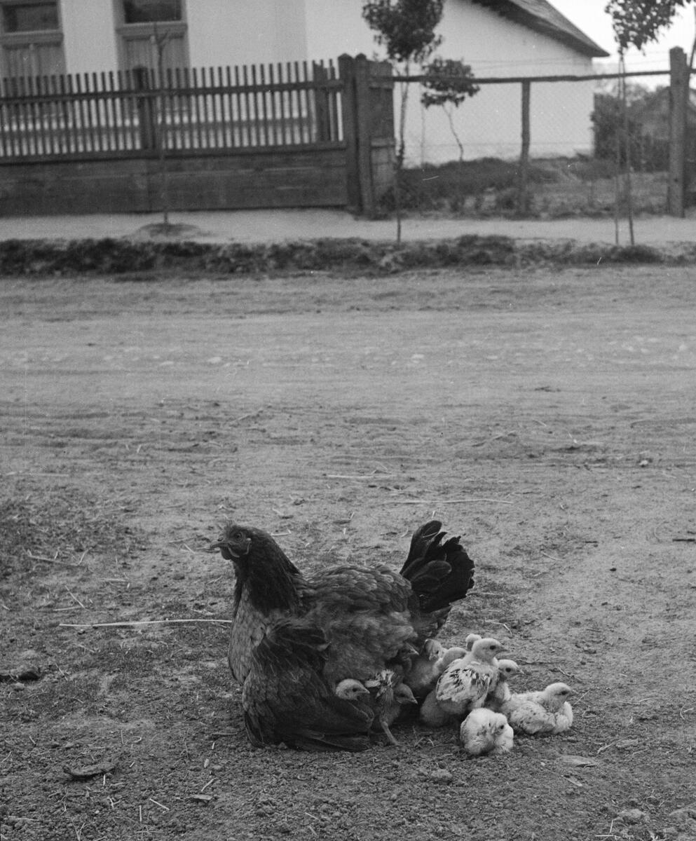 En höna med sina kycklingar. Ungern. Tjeckoslovakien-Ungern-Österrike 1935.