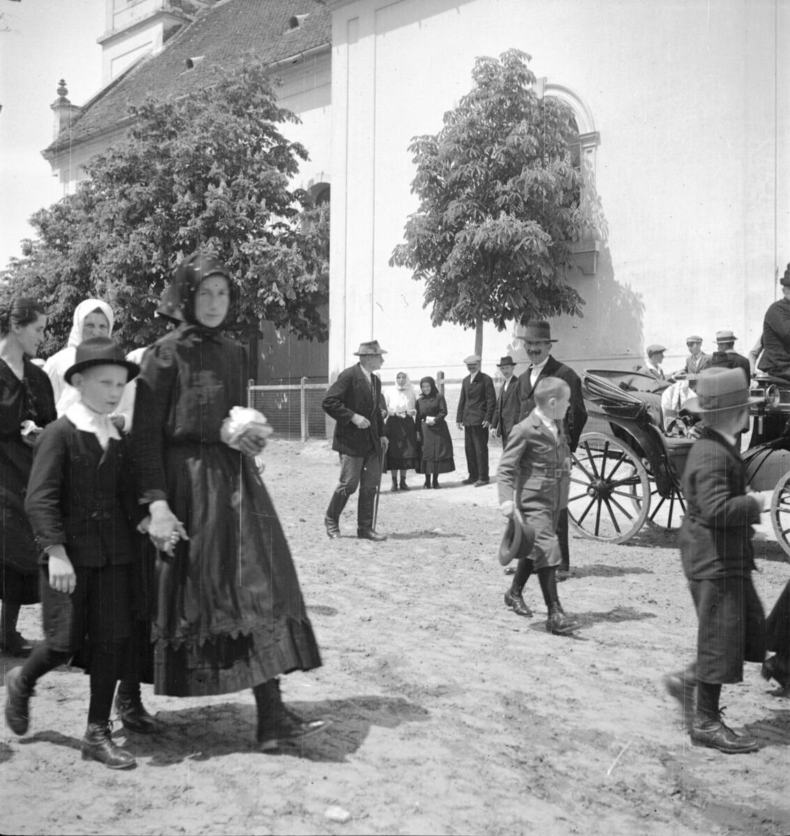 Kyrkobesökare utanför Sankt Martins kyrka i Vörs. Tjeckoslovakien-Ungern-Österrike 1935.