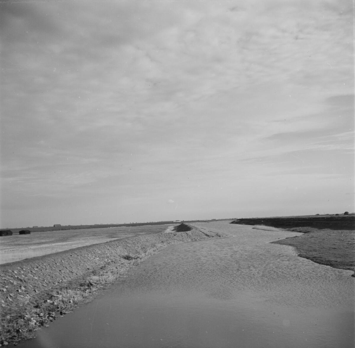 Titel: Vid Zuiderzee, (nuvarande IJsselmeer). Tyskland-Holland-Belgien 1938. IJsselmeer är en insjö i Nederländerna som uppstod genom uppförandet av en dammbyggnad i Zuiderzee, en vik av Nordsjön.