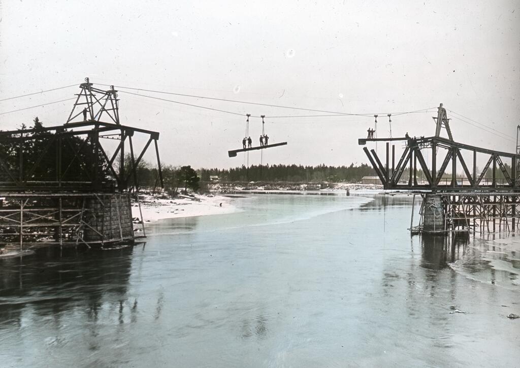 Titel: Byggande av bro över Ljusnan. Märkt G Berglunds Ljusbildstillverkning