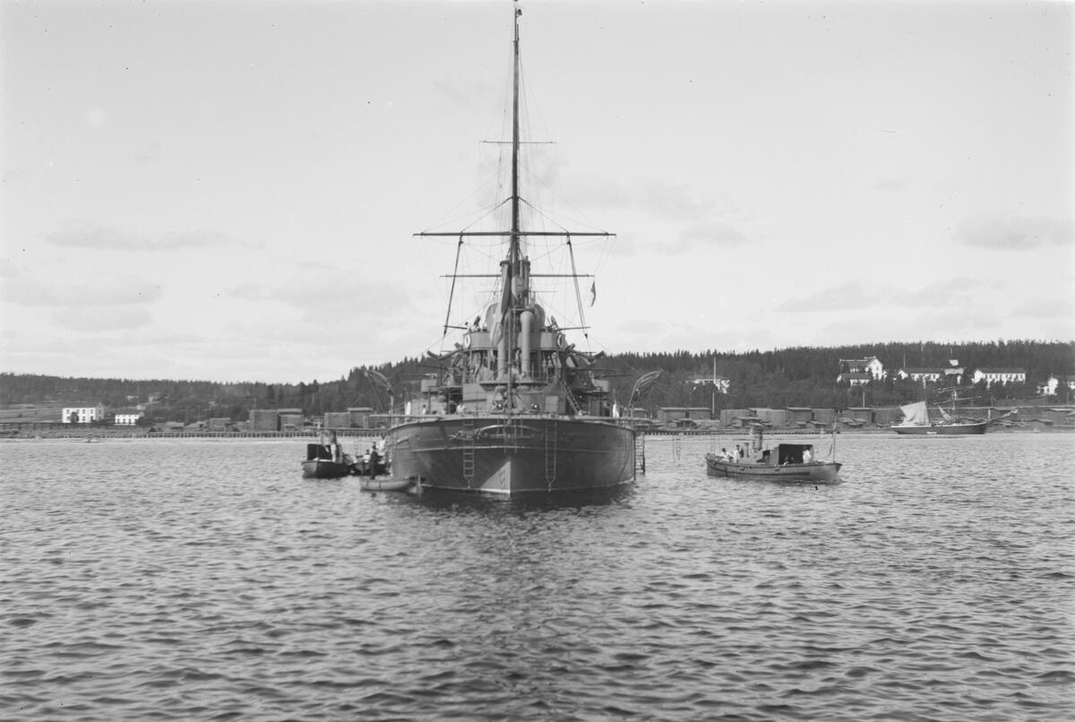 Titel: Ett örlogsfartyg i Härnösand under det tyska flottbesöket.