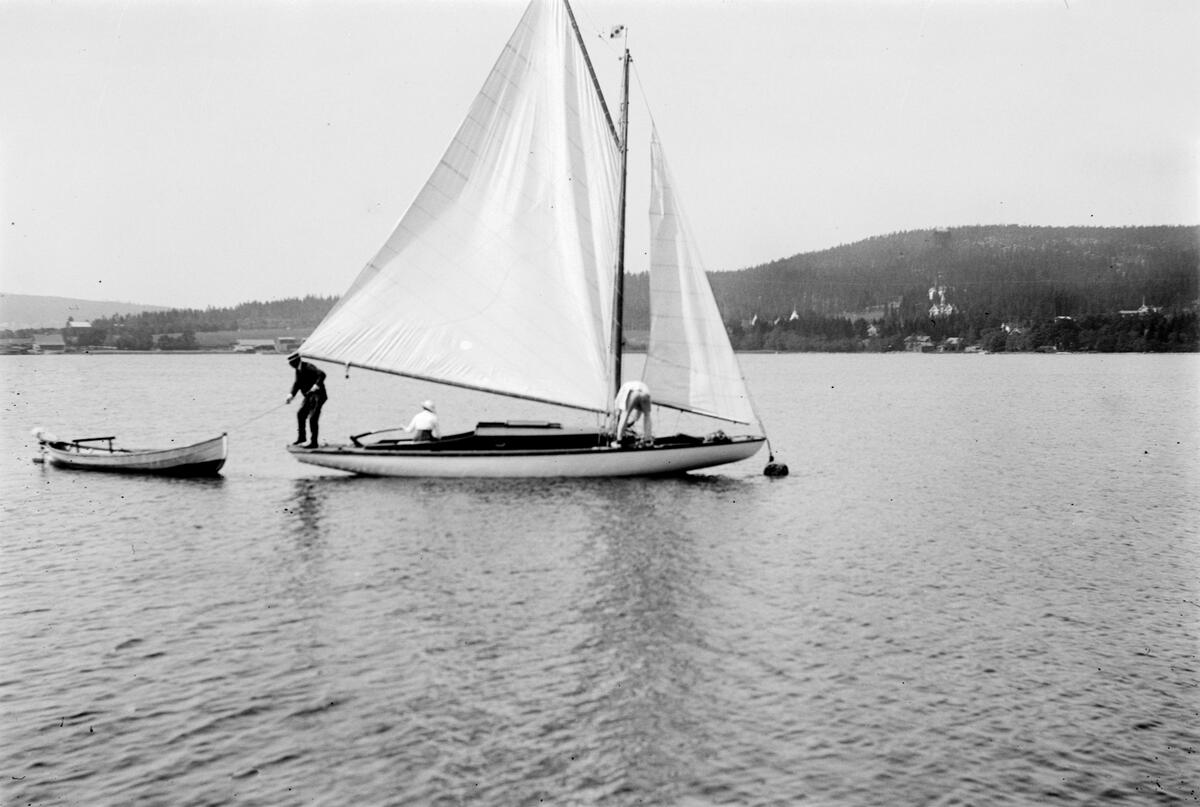 En segelbåt som tar en mindre roddbåt på släp. Södra sundet i Härnösand.