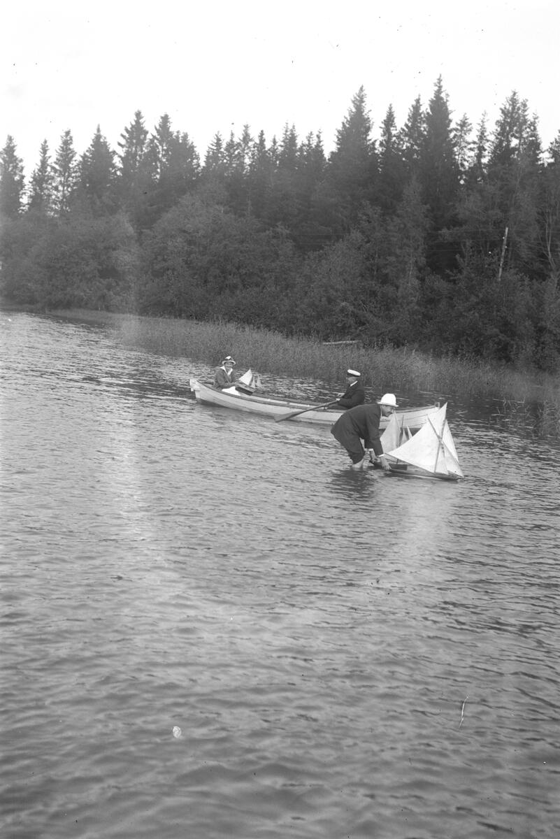 En man som står i vattnet och placerar ut en modellbåt. I bakgrunden en roddbåt.