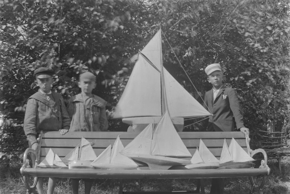 På en parkbänk står det sju olika modellbåtar. Bakom parkbänken står det tre pojkar.