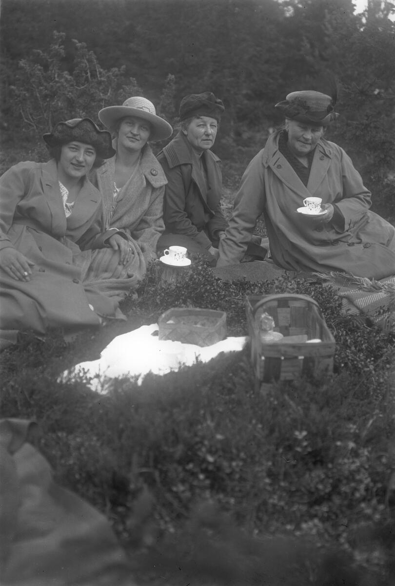 Fyra kvinnor ute på en utflykt sitter samlade kring en duk. På duken står det en korg.