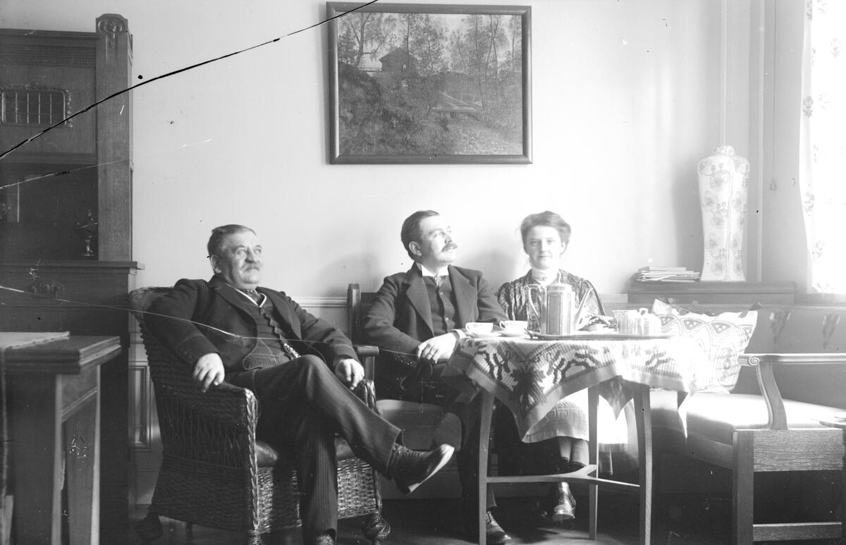 Två män som sitter vid ett litet bord. Bredvid dem sitter en kvinna.