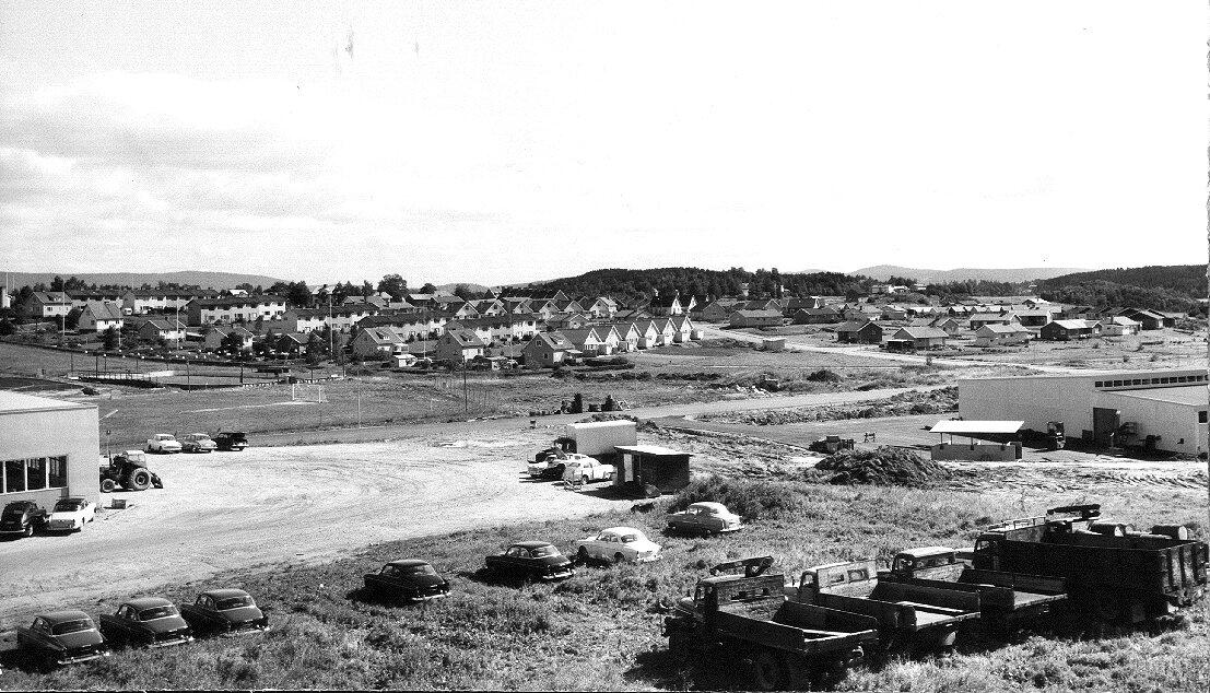 Titel: Vy från Ängsgatan mot Gumås. Gamla Volvo försäljning/verkstad i förgrunden mot Radhusvägen och Skarpåkern.