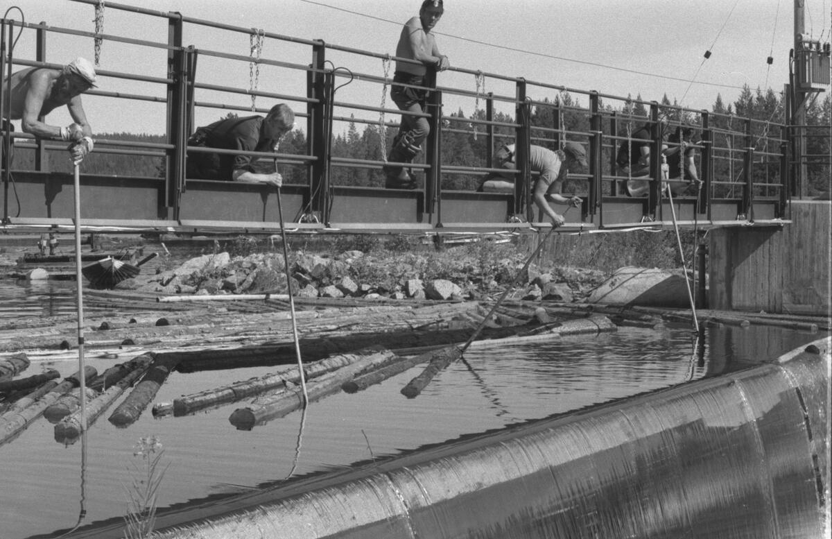 Fångsjön, gamla Lövön. Timmer som smitit framför stängbommen hålls emot, ca 1 minut, tills tillräckligt med vatten har tappats i strömmen.