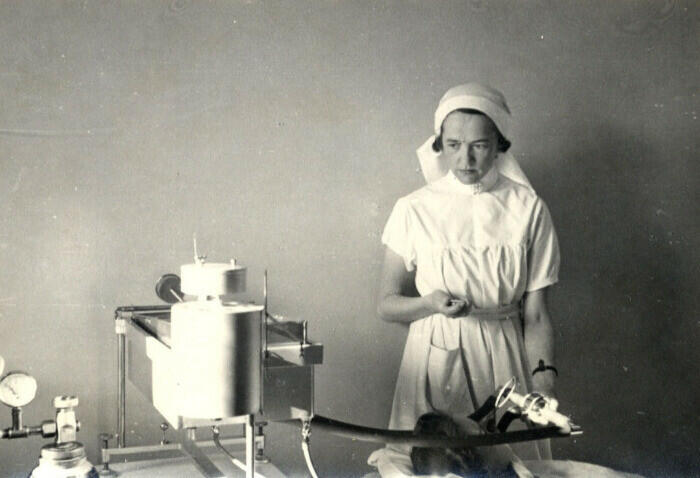 Bilden visar en sjuksköterska som utför ämnesomsättningsundersökning på en patient. Tiden kan vara 1930-40 tal.