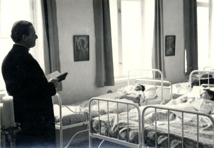Bilden visar på ett dop tillfälle då flera barn döptes samtidigt. De barn som inte hade egna dopklänningar fick låna en av BB avdelningen.