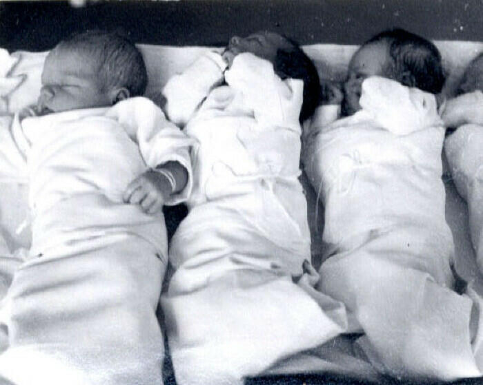 Nyfödda barn i gemensam säng på väg till mammorna på storsal.
