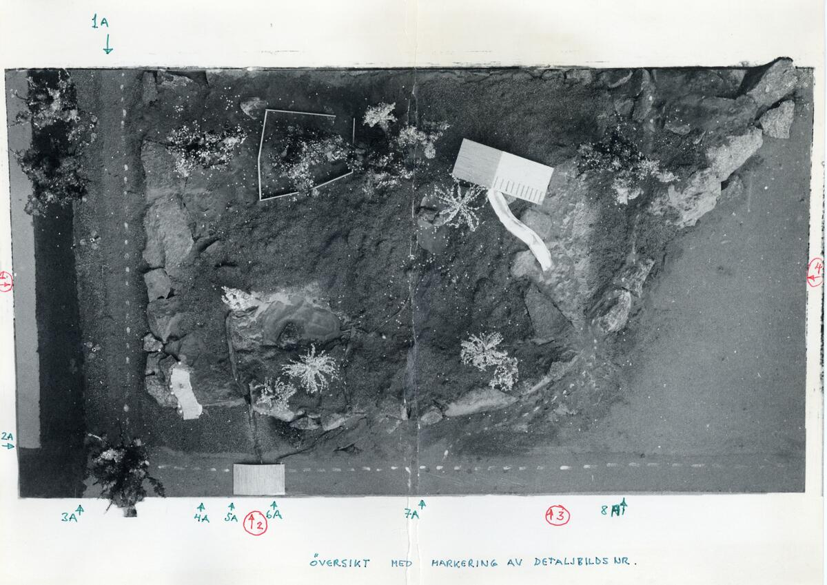 Modell av Roselundsparken. Översikt med markering av detaljbildsnummer.