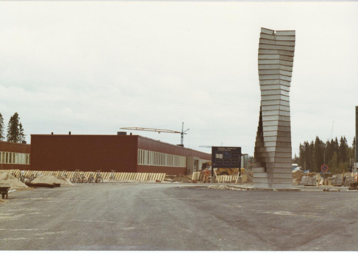 Skulptur, "Mänsklig byggnad". Uppförd i 10 meter rostfritt stål utanför Tekniska Högskolan i Luleå.