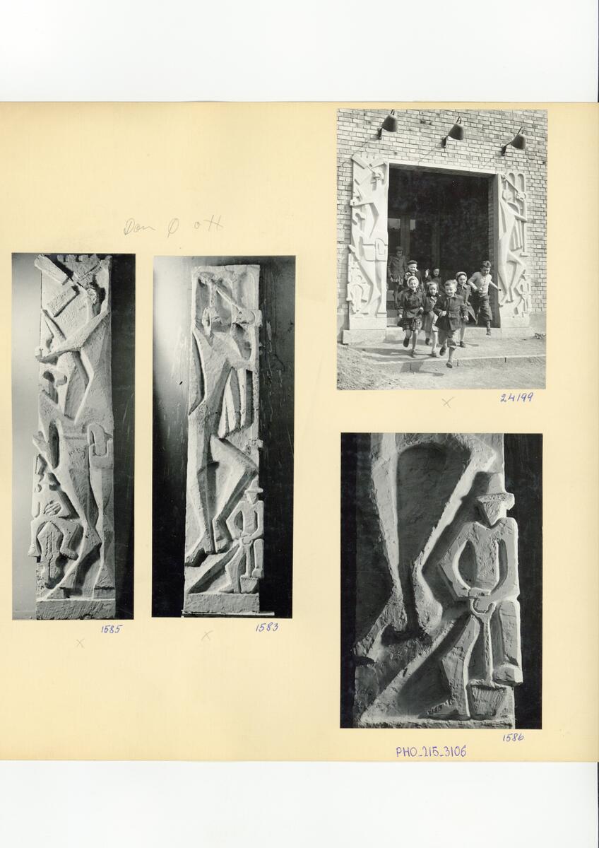 Portal i relief, "Don Quijote och Hamlet". Fotografi från Björkhagens Folkskola.