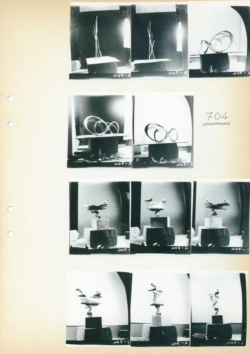 Bilder av en skulptur, av mässing, Rasande balans. E-tuna. Malmö.; På fotografi; 2 bilder av skulpturen Rasande balans, 3 bilder av fontänskulpturen Sekvens, 6 bilder av skulpturen Ackumulage.