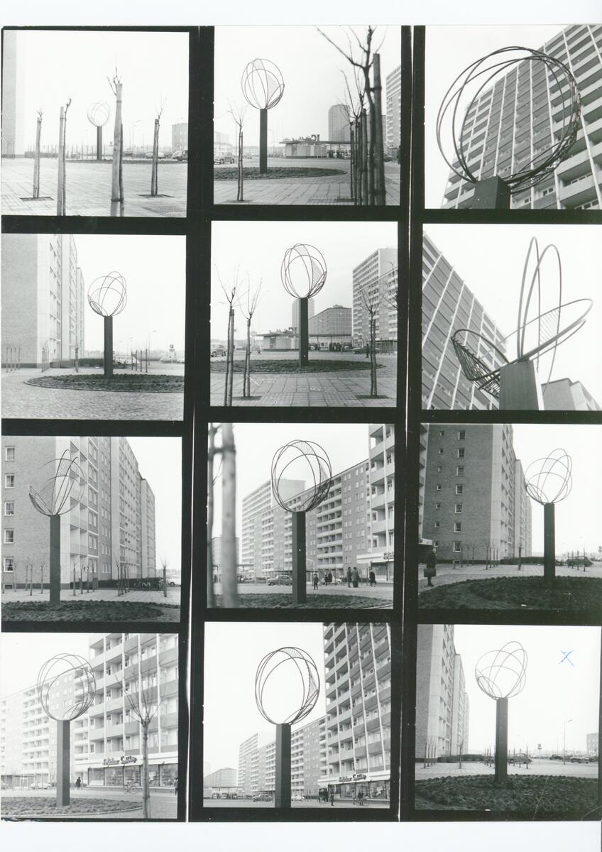 Skulptur, av koppar med granitsockel, "Sfär". Höjd 7 m.