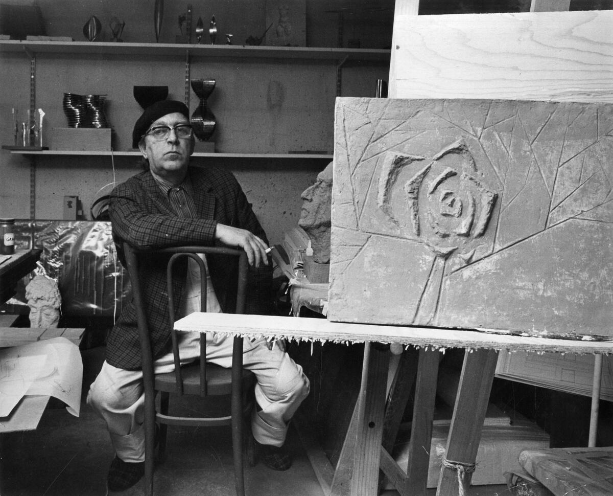 Arne Jones i sin ateljé och med modell av Rosen.