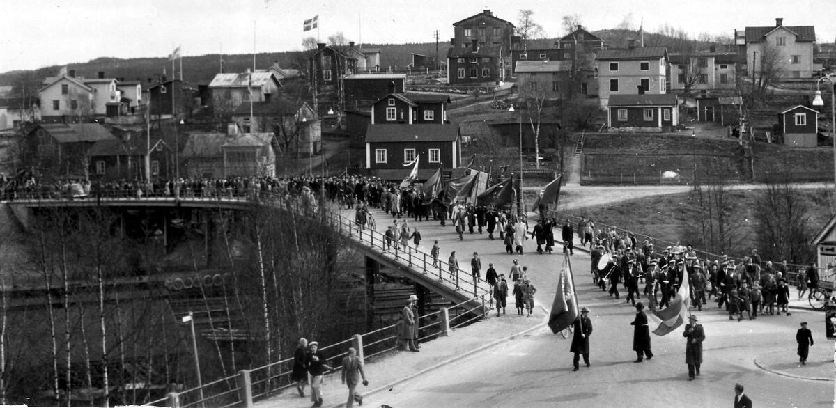 1:a maj demonstrationståg passerar Järnvägsviadukten i Härnösand.