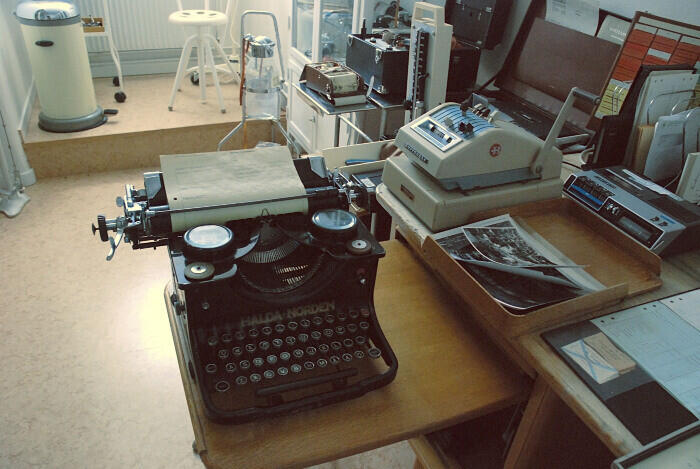 Läkarens skrivbord med bl.a. gammal Halda Norden skrivmaskin.
