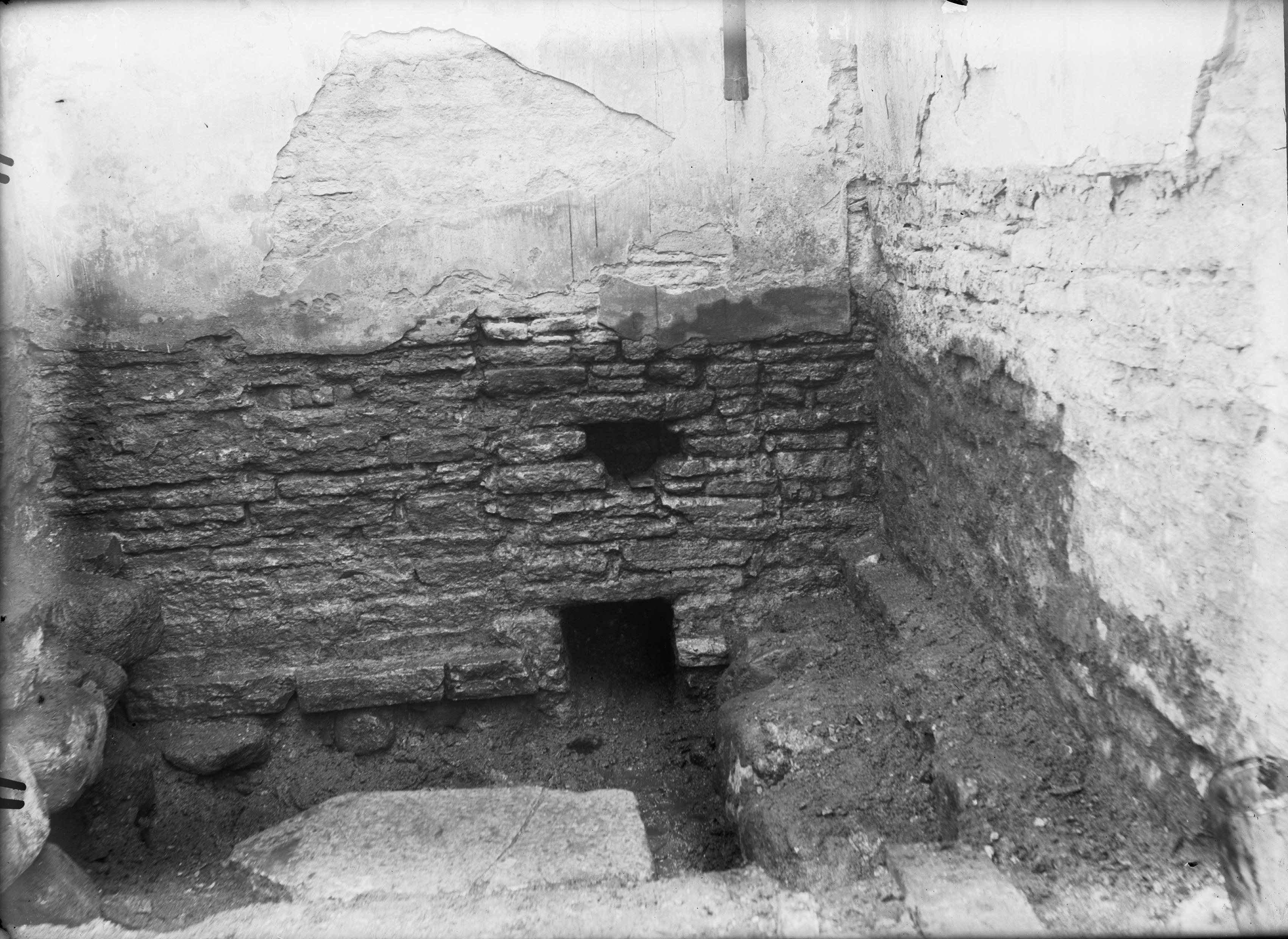Hörnet mellan södra fasaden och De la Gardies gravkor, före grundförstärkning, från sydväst.