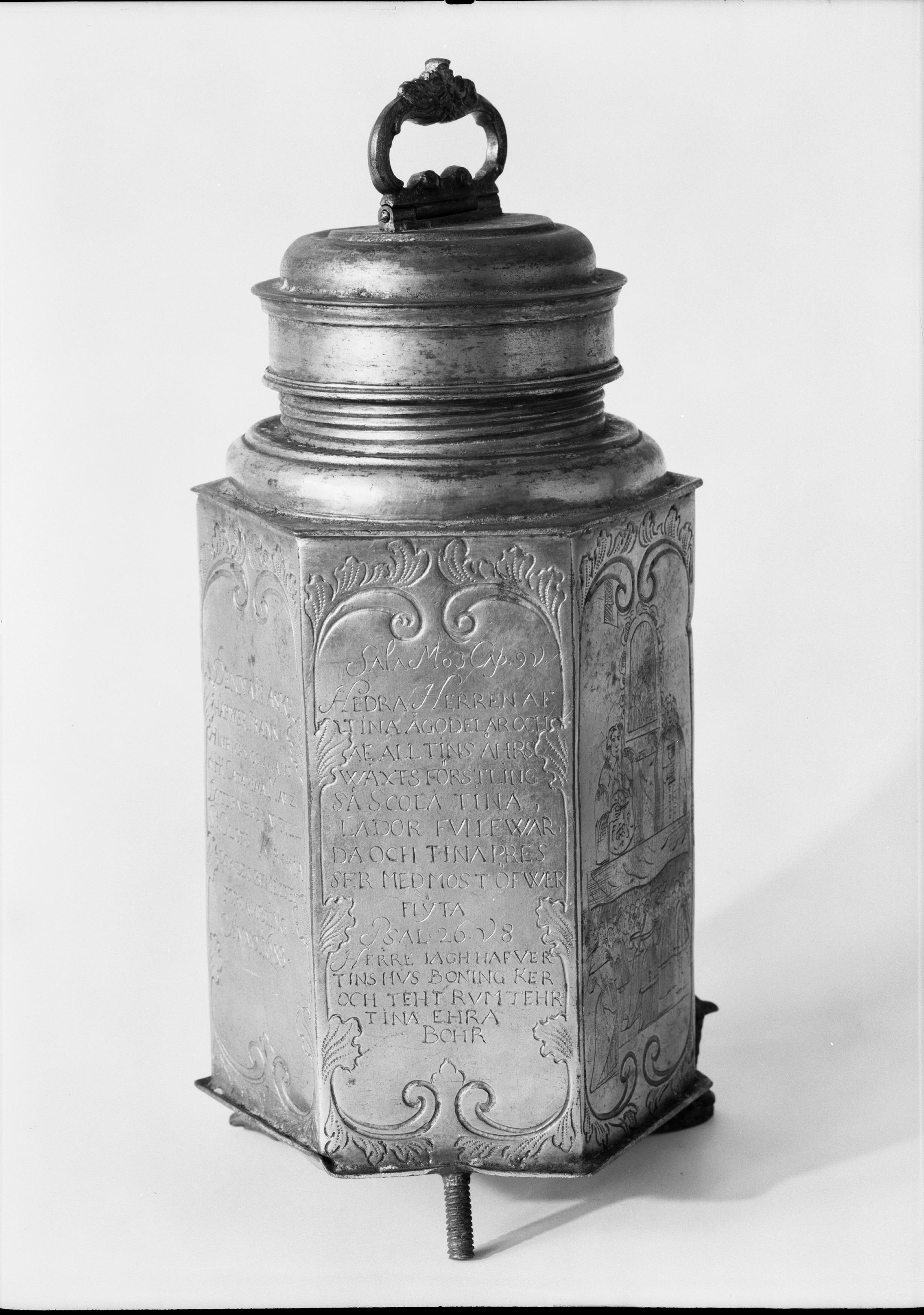 Vinbehållare, vinflaska av förgylld mässing från 1688.