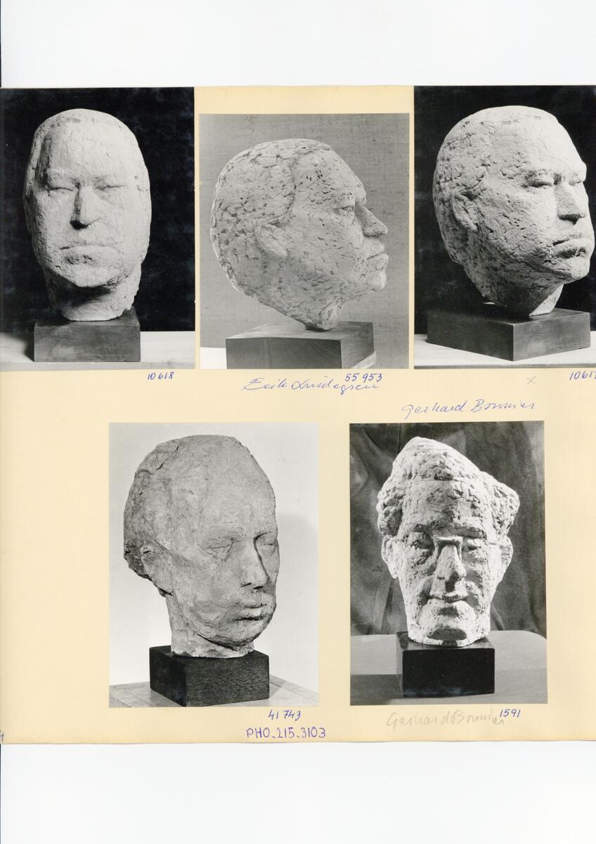 4 bilder av en skulptur, porträtt av Erik Lindegren, 1 bild av en skulptur, porträtt av Gerhard Bonnier.