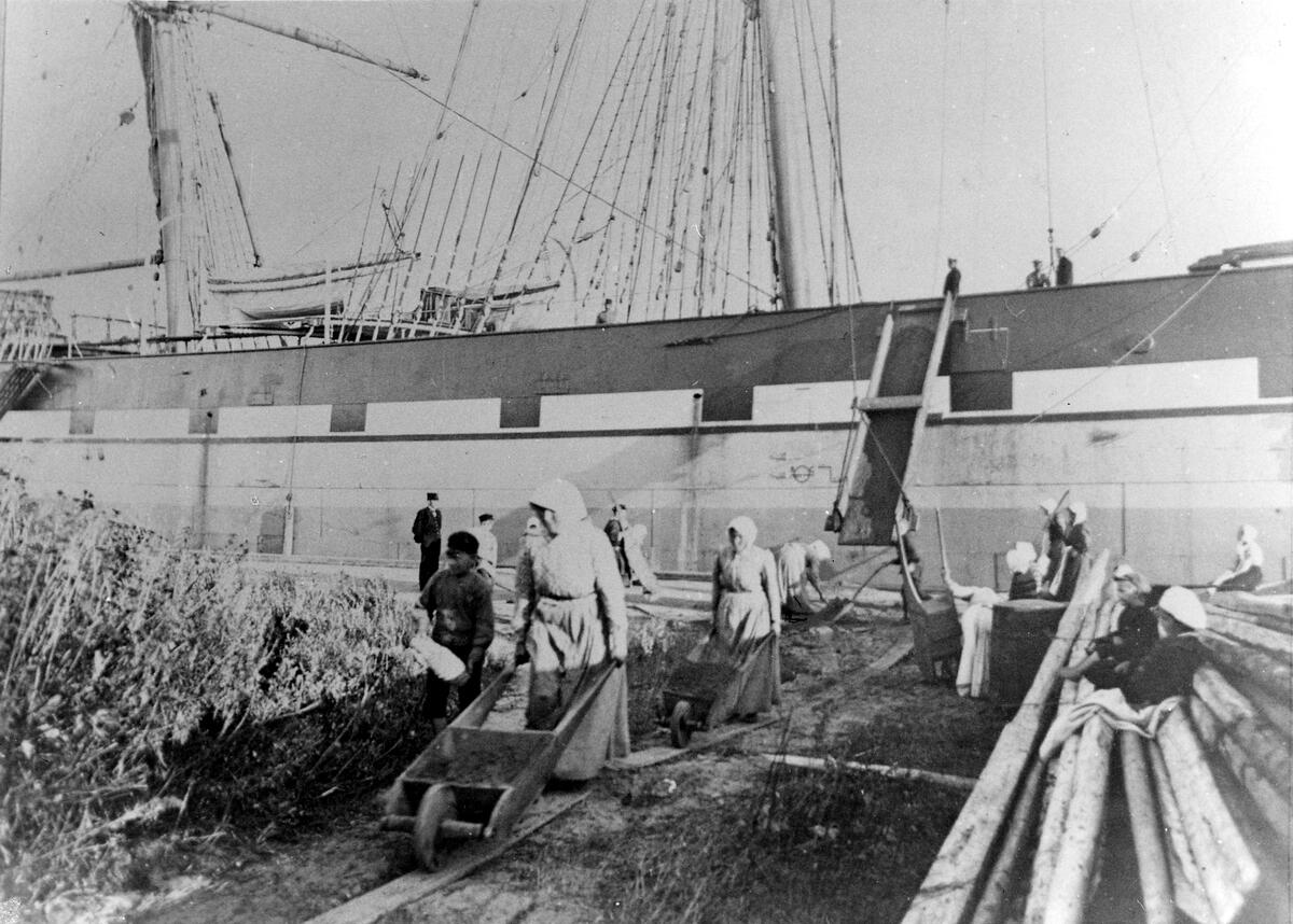 Titel: Wifsta Varf. Vid barlastkajen. Gummorna kör barlast och tippar den från fartyget.