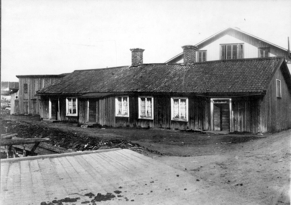 Gammalt hus vid broövergången vid bäcken till Bockholmstjärnen, Kronholmen. Bakom den gamla längan skymtar dåvarande Edbergs gelbgjuteri.