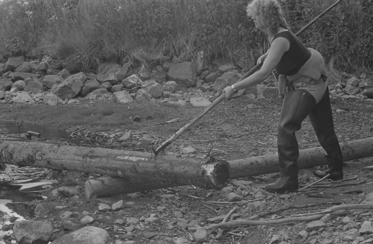 Bäckmyrviken. Lilian Eriksson landrensar. Observera hur hon utnyttjar en stock att rulla på.