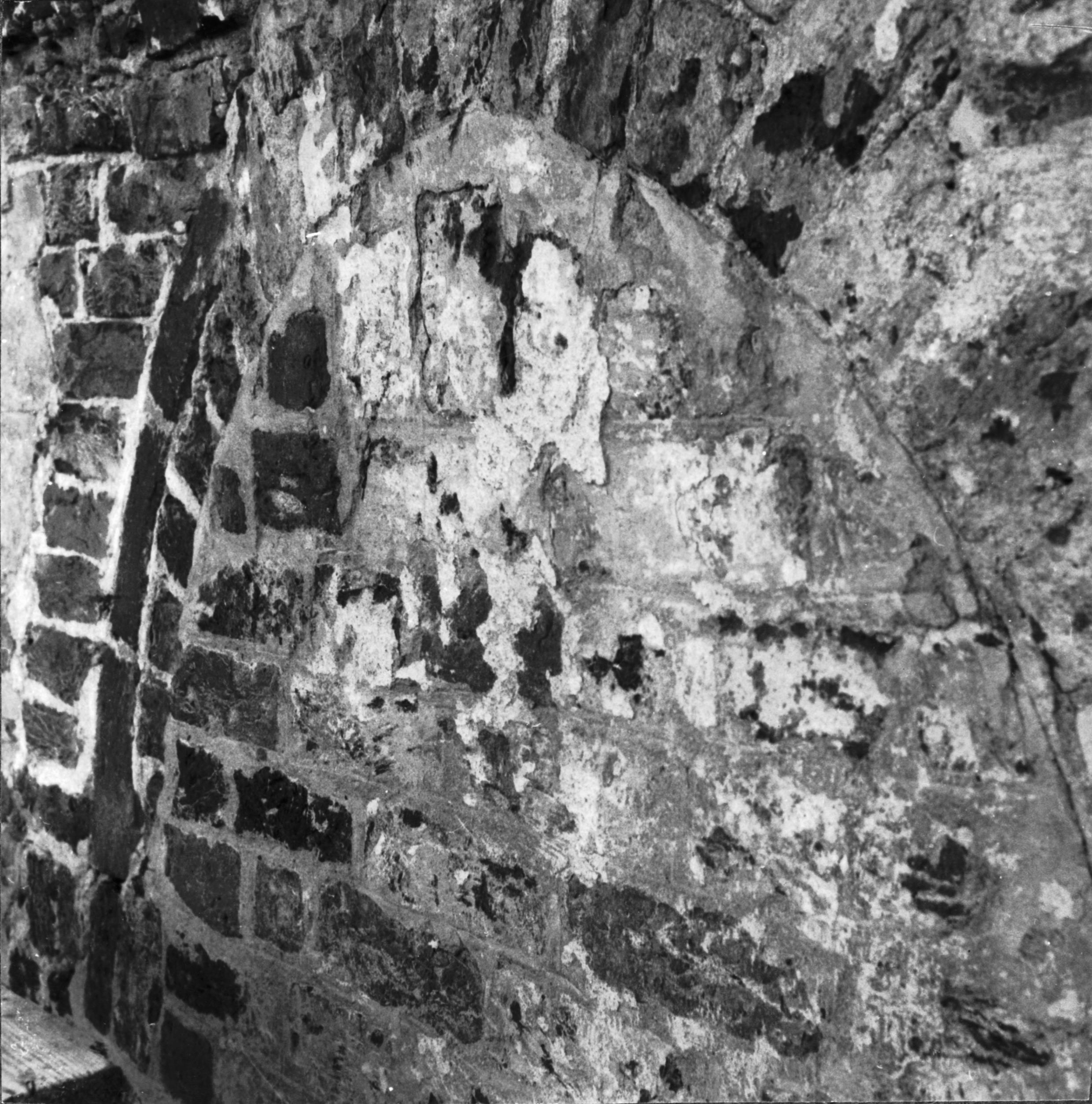 Del av kyrkans norra fasad. Fönsterbåge i tegel över östligaste fönstret.