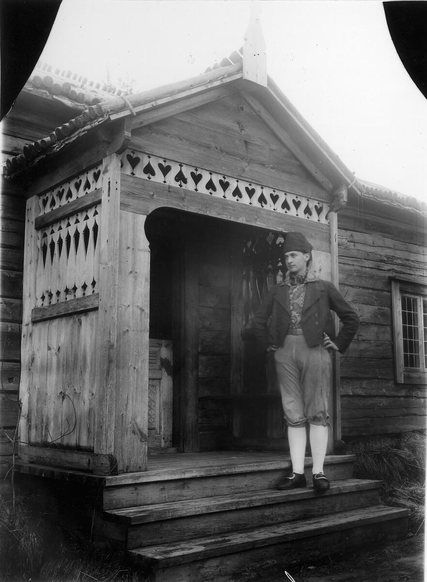 Kandidat Jonas Högberg i Junseledräkt framför farstukvist från Junsele.