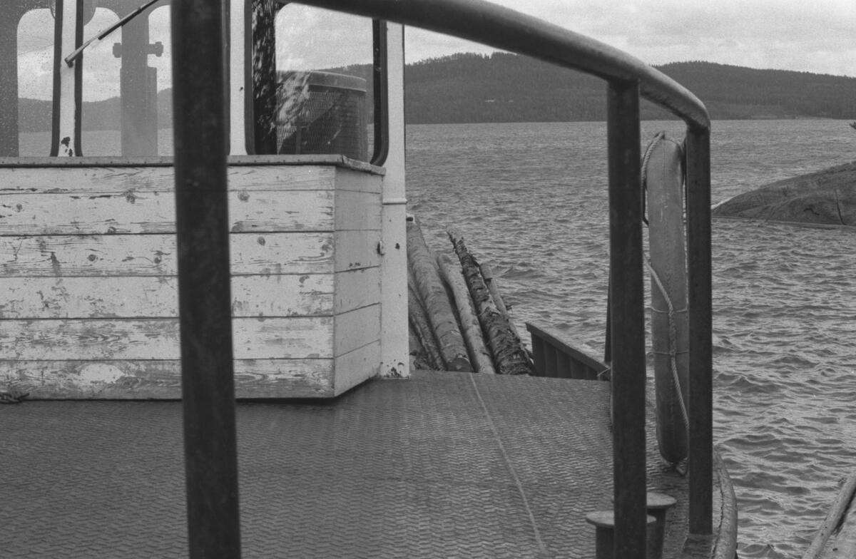 Uppströms Strömsundsbron. Några stockar har smitit då "tapparna" kopplats ihop.