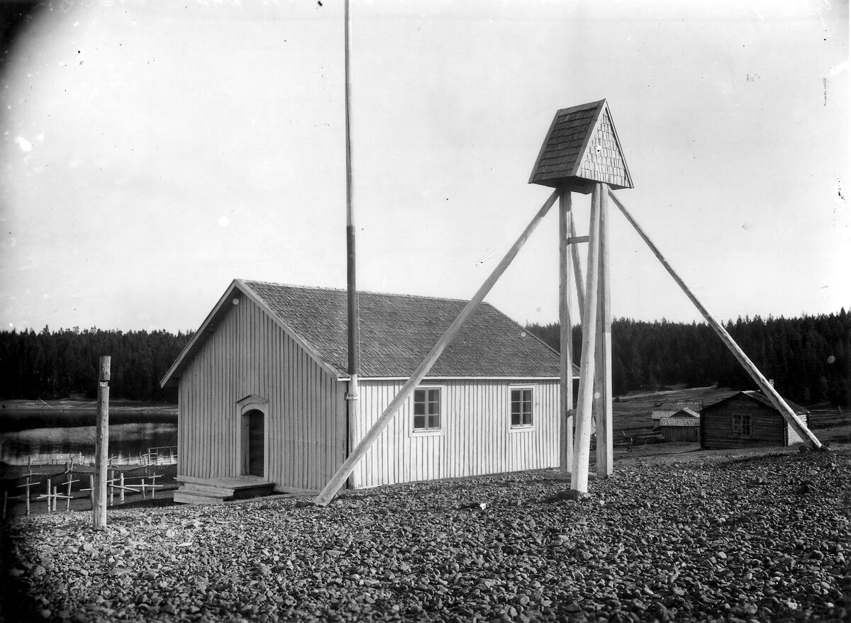Fiskekapell, timrat, panelklätt och vitmålat. Rektangulär byggnad med enkel, vitmålad inredning. Enkel klockställning står något ifrån.