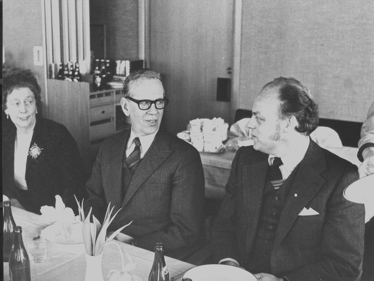 Deltagare vid lunch i Kramfors, inbjudare Ö.T.G, vid starten för byggandet av Ö.T.G.; Från vänster: Anna Forsberg, Sandslån. Till höger kommunstyrelsens ordf. Kurt Jansson, Bollstabruk