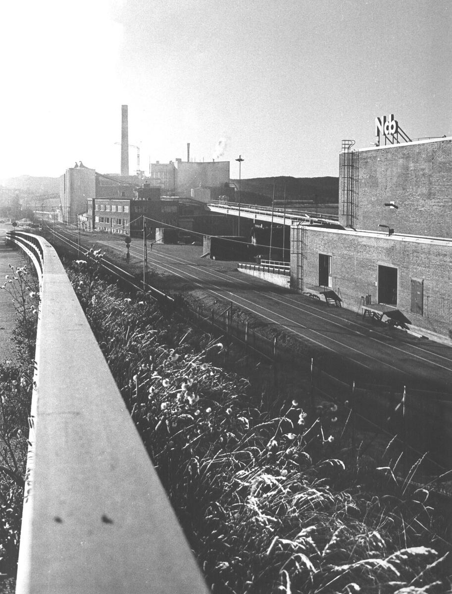 Exteriör av Väjafabriken, sedd från söder med nya pappersbruket P-M.6 till höger.