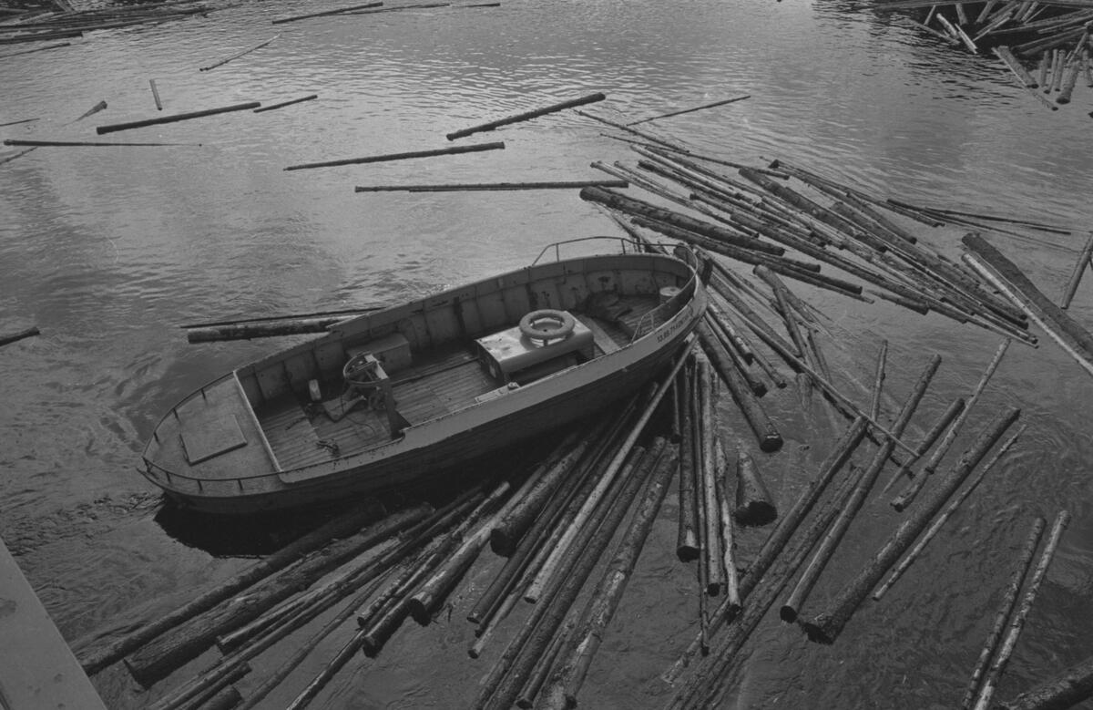 Ihoppackning av virket med radiostyrd båt i Ramseledammen. Gerhard Sevedsson styr båten.
