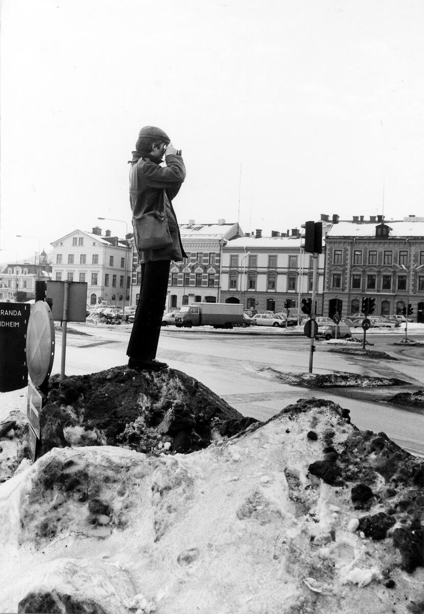 Länsantikvarie Bengt Häger dokumenterar. Gavelhuset till vänster är "Gamla tullhuset", tomt nr 5.