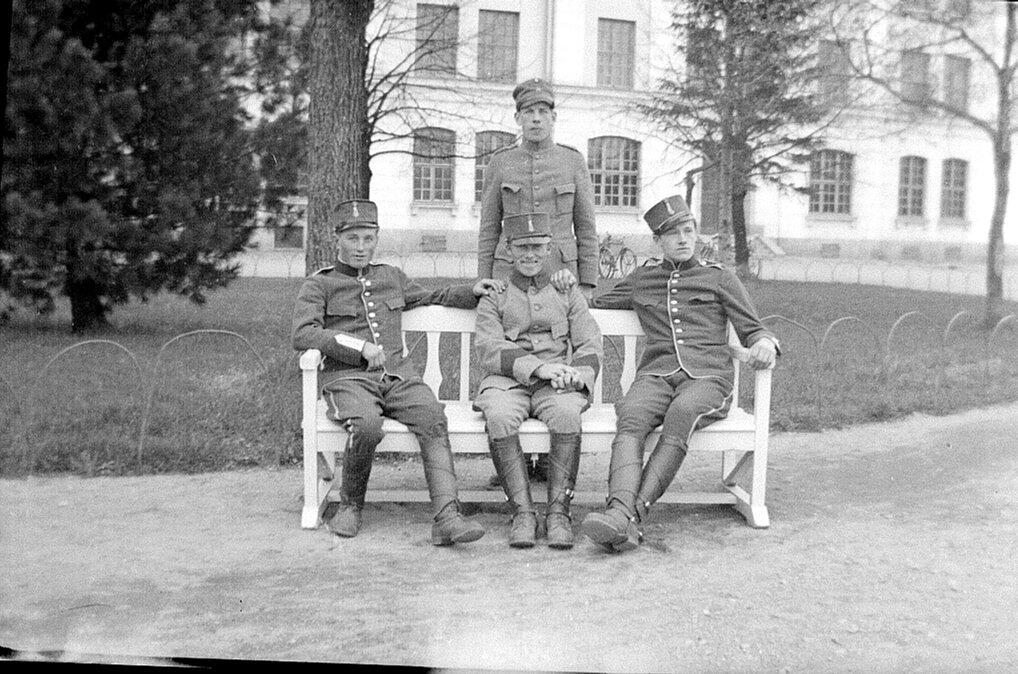 Grupporträtt, militärer. Fr.v en Arnäsbo, Jonas Näslund, Norberg från Sunnansjö. Bakom en Sundsvallsbo.