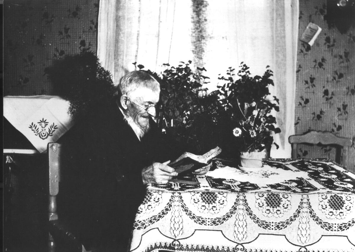 Torpare Lars Petter Sandström, orgeltrampare i Skogs Kyrka. Arbetare och rättare på Fantskog. Född 1848 i Umeå landsförsamling. Död 1938 i Prästbordet, Skog 90 år. Bilden visar Lars Petter i sitt hem på Ellensberg.